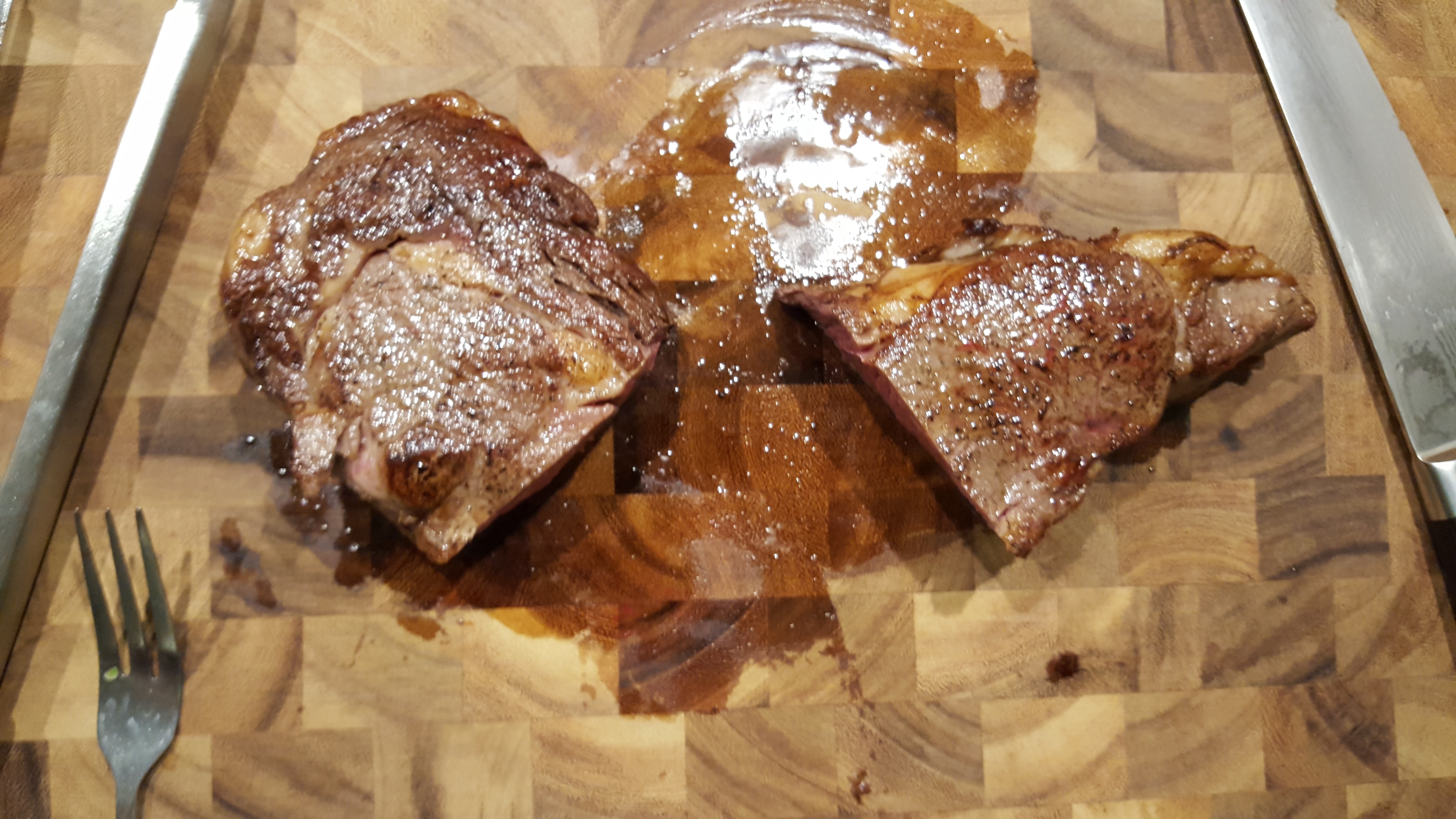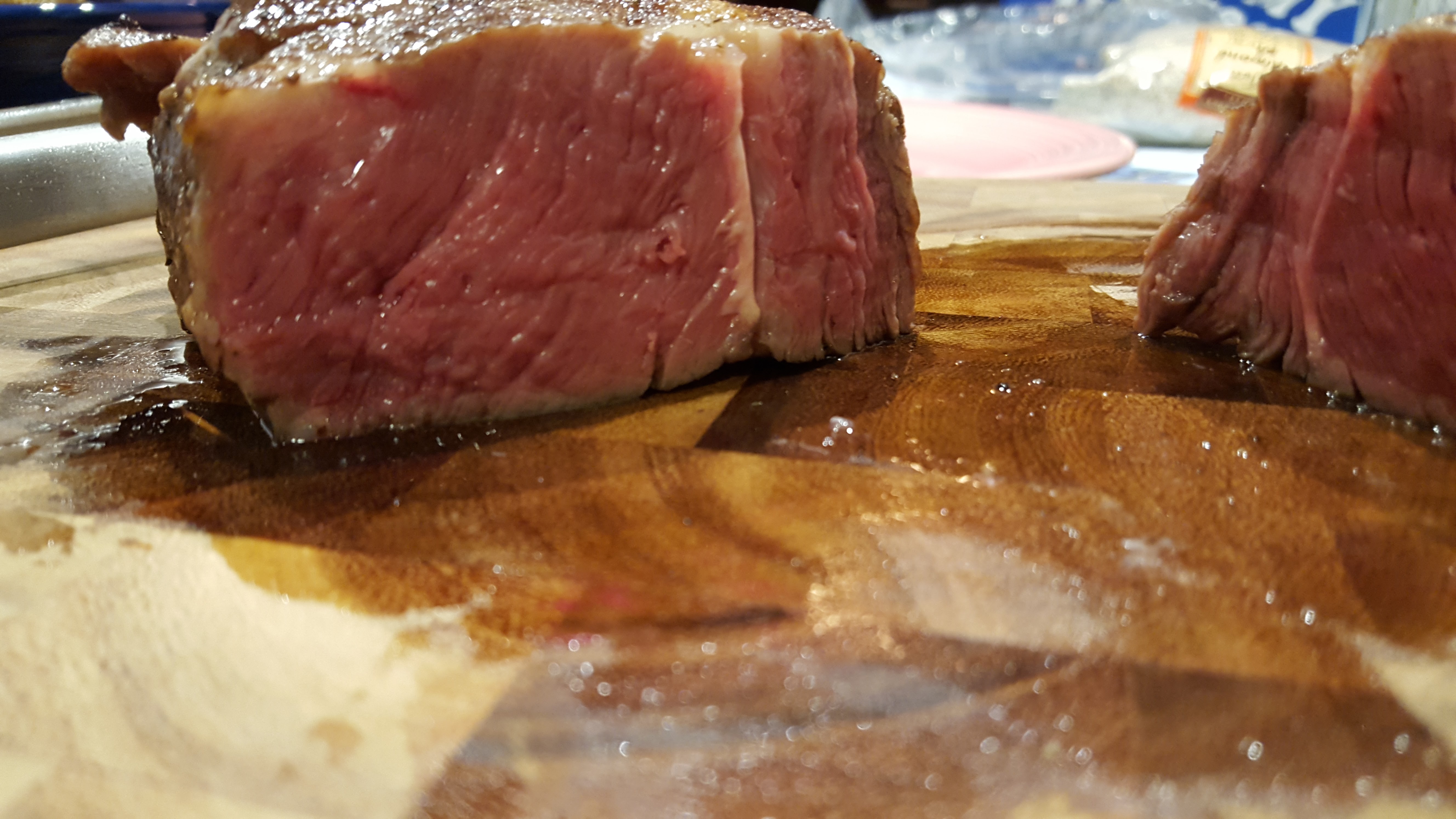 Well, like anything, there are many ways to get a consistently cooked perfect medium rare steak. You can let the steak reach room temp, sear the outside and finish it in the oven or you can sous vide the steak and finish it with a nice sear. The oven cooking technique requires a little more experience and has more room for error, if you over-sear the outside of the steak you end up with terrible grey lines like this: